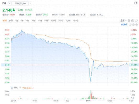 但3月4日午后,原本平静的港股市场被投下了一颗“石子”而掀起波澜——多想云股价突然闪崩,股价一度跌超86%,回吐年内大多数涨幅。截至3月4日收市,该股跌51.14%,报2.14港元,成交额1.34亿港元,成为港股市场主板中当日跌幅最大的个股。