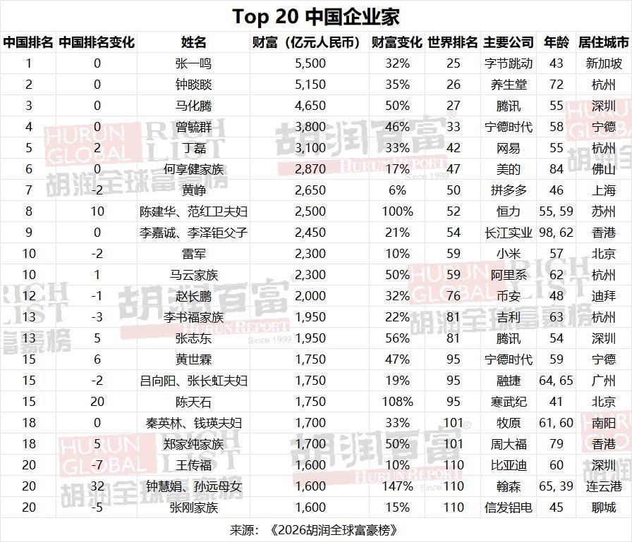 【大河财立方消息】3月5日,胡润研究院发布《2026胡润全球富豪榜》。