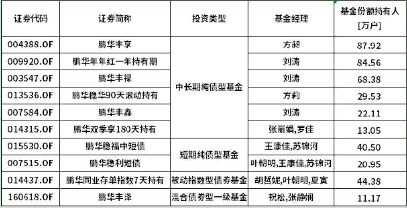 剔除货币基金后,在鹏华固收的产品矩阵中,共有10只产品持有人户数均超过10万户: