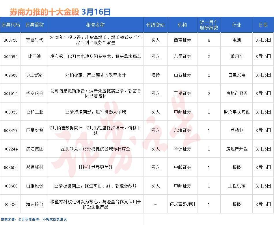 比亚迪也备受券商关注,近一个月获华金证券、开源证券等3份券商研报关注,位居3月16日券商力推股榜第二。