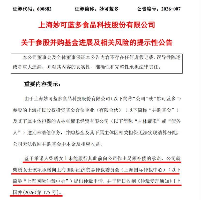 妙可蓝多称,自2025年1月以来,公司多次敦促承诺人柴琇履行基金事项相关承诺,在上述承诺未能得到履行的背景下,公司已就柴琇该项承诺向上海国际经济贸易仲裁委员会(上海国际仲裁中心)提出仲裁申请,并于近日获得受理。