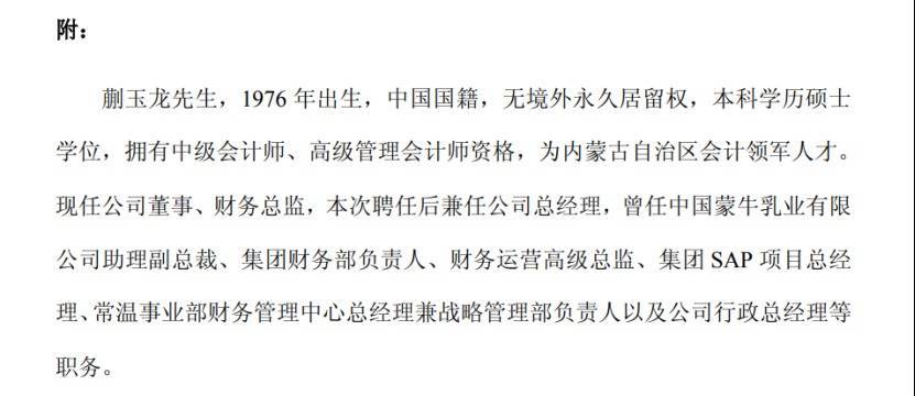 同时,公司聘任蒯玉龙担任总经理,法定代表人也相应变更为蒯玉龙。公开资料显示,蒯玉龙拥有多年蒙牛任职经历,曾任中国蒙牛乳业有限公司助理副总裁、集团财务部负责人等多个核心职务,是典型的蒙牛系职业经理人,此次任职也标志着妙可蓝多进入蒙牛系主导的管理阶段。