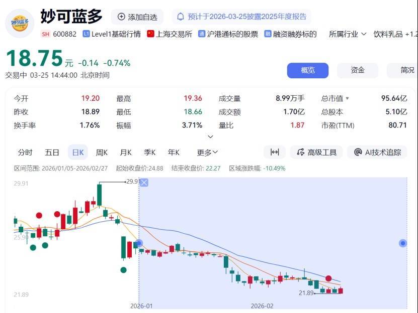 截至记者发稿,妙可蓝多股价报18.75元/股,日内跌幅0.74%;自年初至今的区间跌幅达10.49%,市值报95.64亿元。